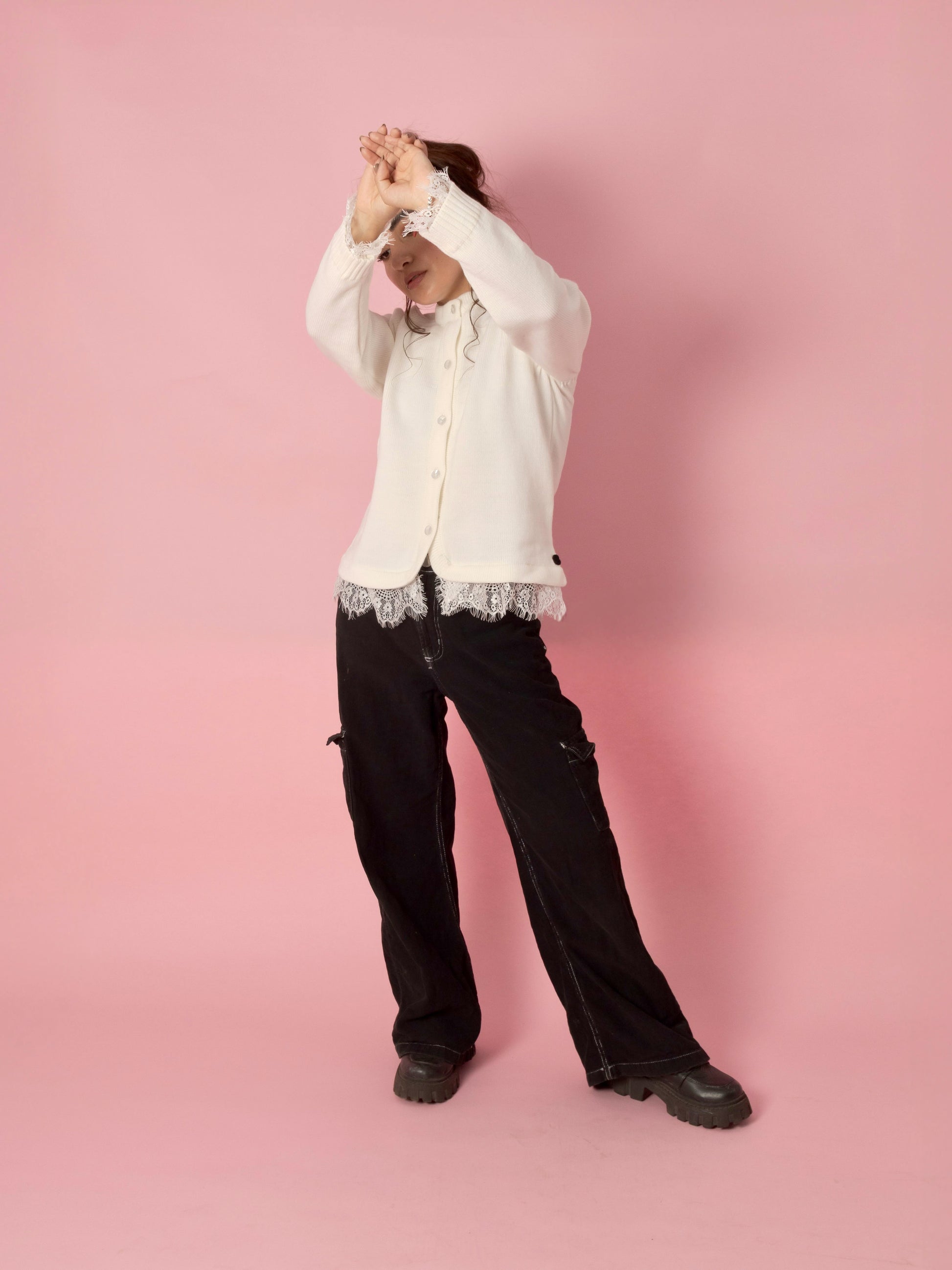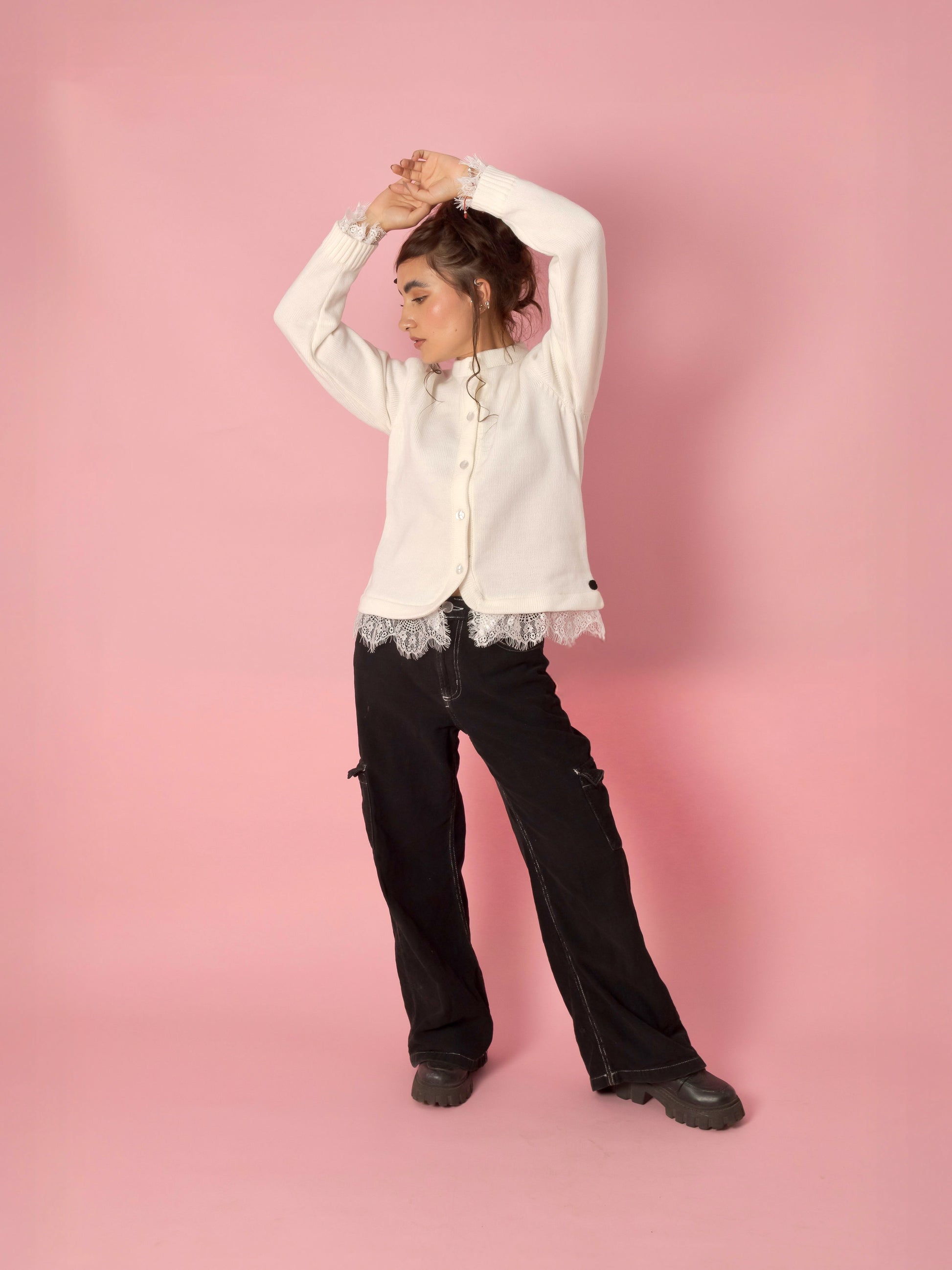 La prenda incorpora cierre frontal con botonadura funcional integrada sobre vista reforzada, asegurando resistencia y acabado prolijo. Como elemento diferenciador, presenta intervención en encaje delicado en puños y ruedo inferior, aplicado mediante proceso de confección controlado que equilibra textura, feminidad y sofisticación estructural.