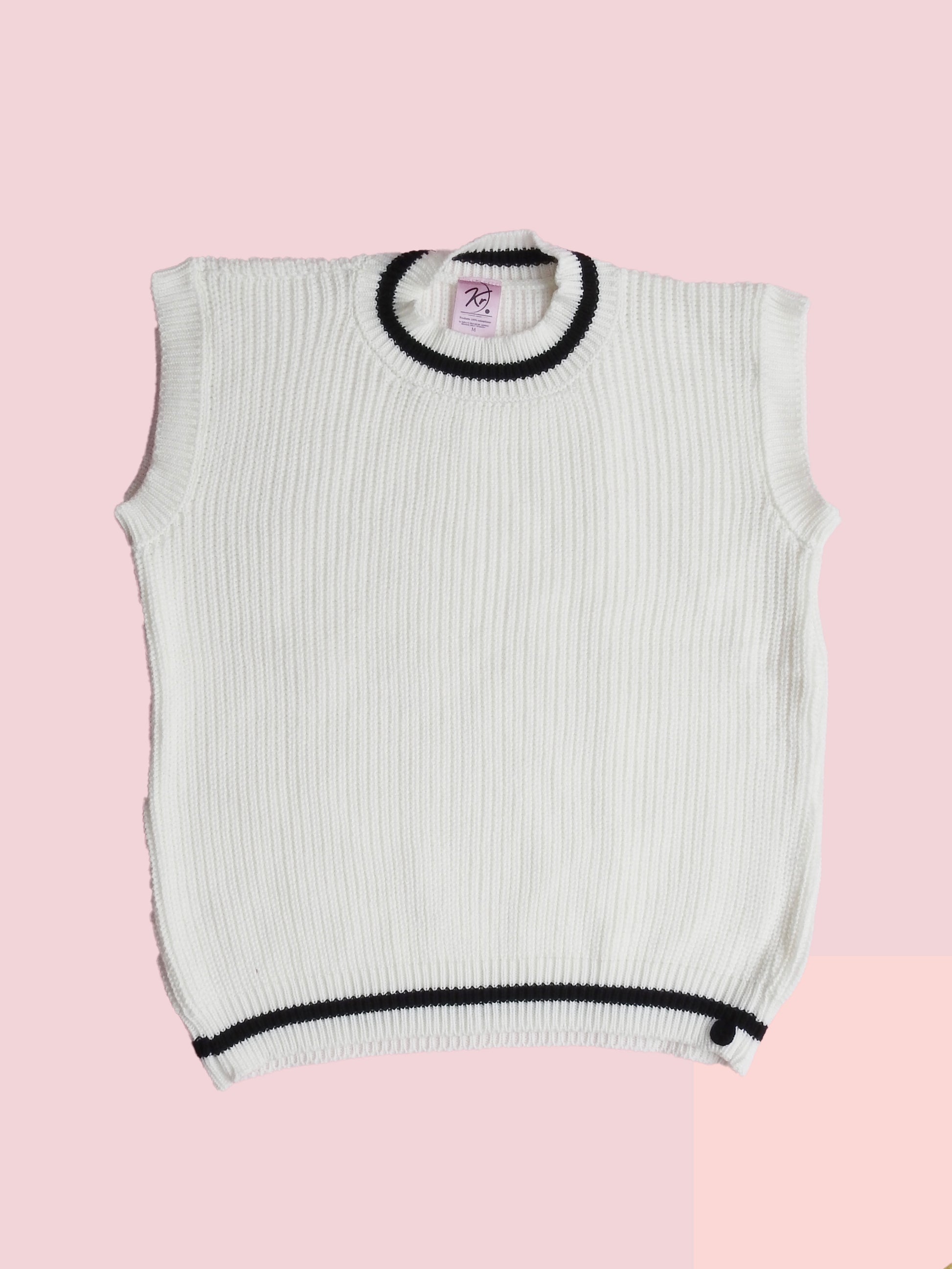 Está tejido con un patrón de punto inglés, que es un tipo de tejido que crea un relieve en forma de pequeñas ondas o celdas. Este patrón añade textura y detalle al chaleco, creando un aspecto elegante y refinado.